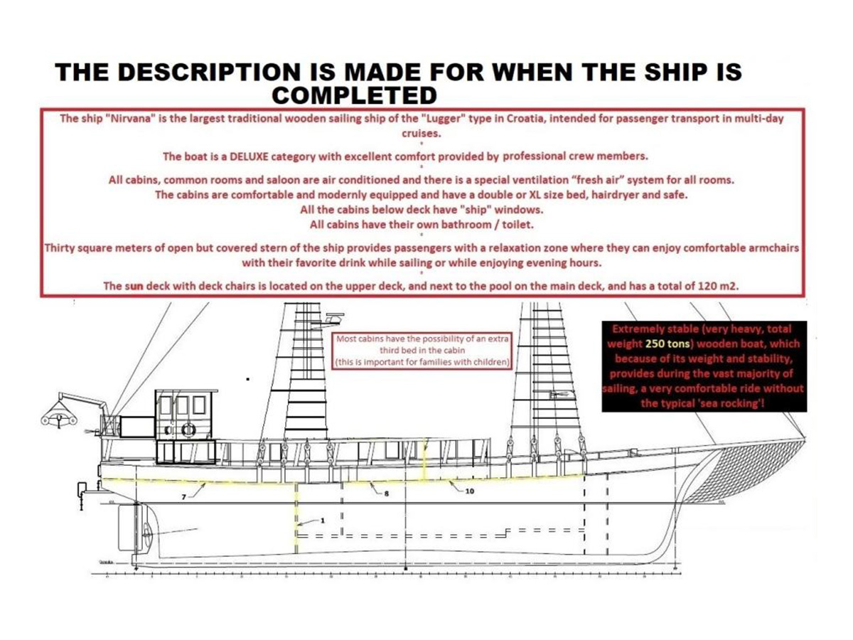 Sailing ship / yacht with motor Nirvana, the largest traditional wooden sailing ship of the "Lugger" type in Croatia, intended for passenger multi-day cruises. Originally build in Genova Italy during 1921 (100 years)